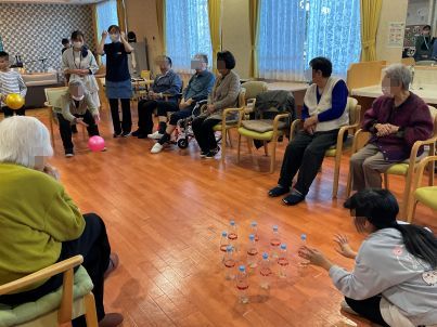 レクリエーション体験🎳今回はボウリングでした。「どうぞ、ボールです。」と利用者様に手渡しし、「こちらに転がしてくださーい!!」と元気に声をかけてくれました。利用者様も満面の笑顔です(o^―^o)ニコ