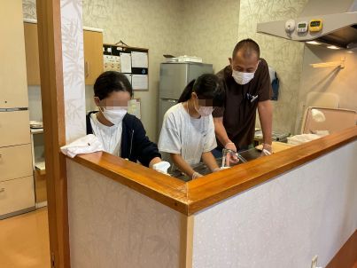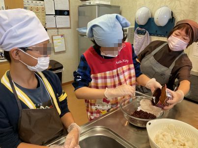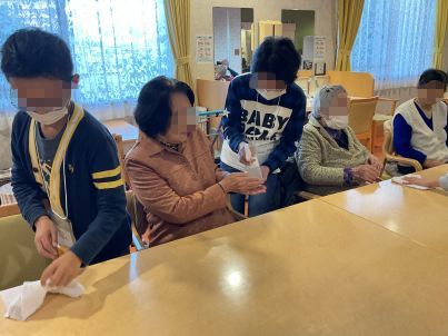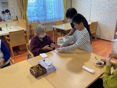 おやつ準備体験!!メニューは・・*ぜんざい*一生懸命缶切りをしてくれ、小豆を準備してくれました。盛り付けをしている間に、テーブル拭きと手指消毒・おしぼり渡しを「失礼します。」と声かけながら丁寧に!「何年生?」 「偉いね。」「ありがとね。」と利用者様も笑顔で声を掛けられていました(^^♪おいしく召し上がって頂いた後は、テーブルを回り、下膳→食器洗い→拭き上げて収納!!