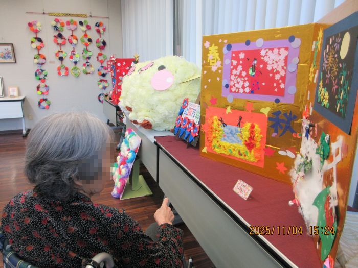 皆様、ご自分のフロアで作成した作品を『すごいね~。良く出来ているね~。』と楽しそうに見学されていました。また個人で出展されたご入居者はお互いの作品の感想を言いながら楽しんで見学されていたご様子です。各階の順位については後日発表させていただきます。皆様お楽しみにお待ちくださいませ♪