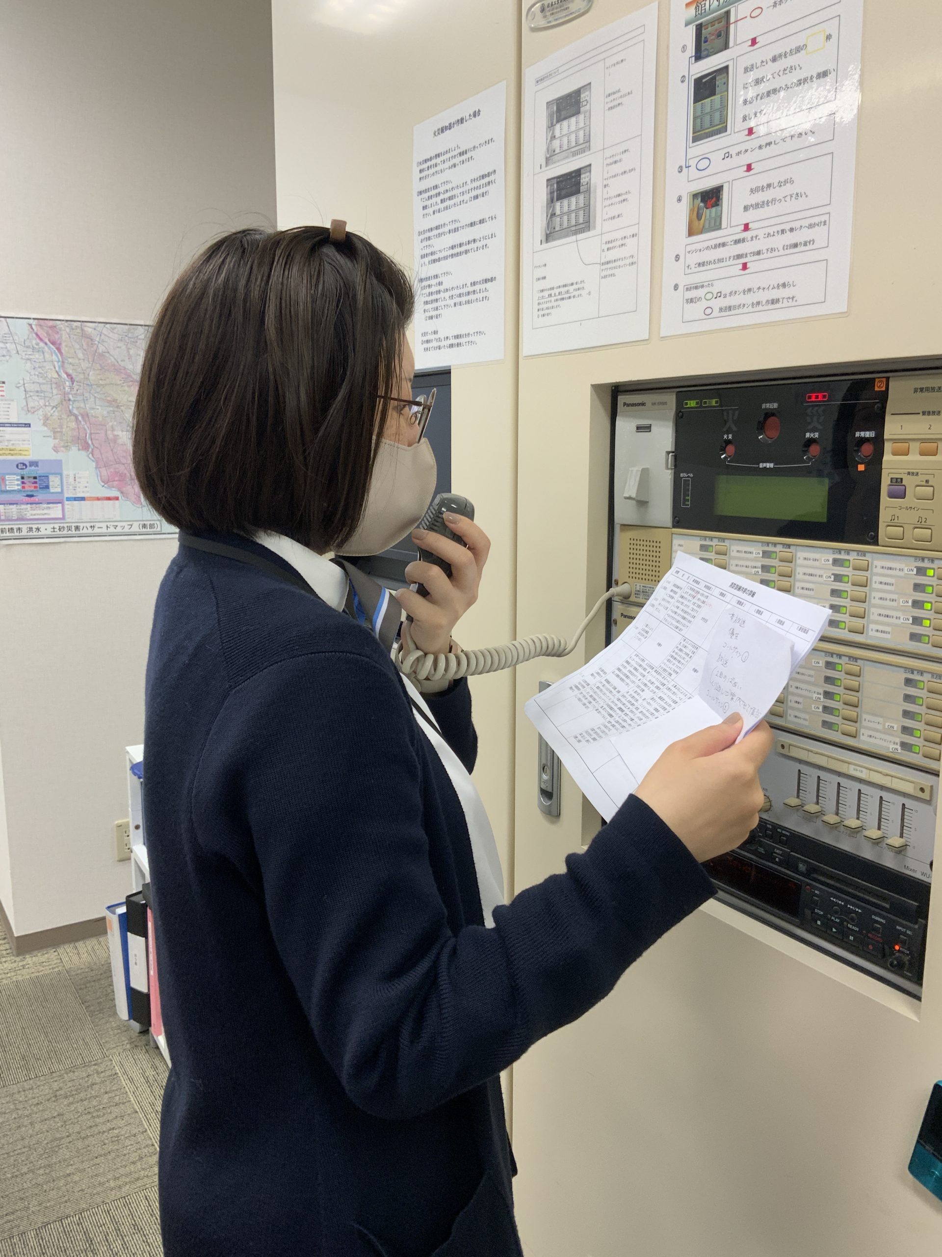 事務所の火災受信機より火災場所を確認します。