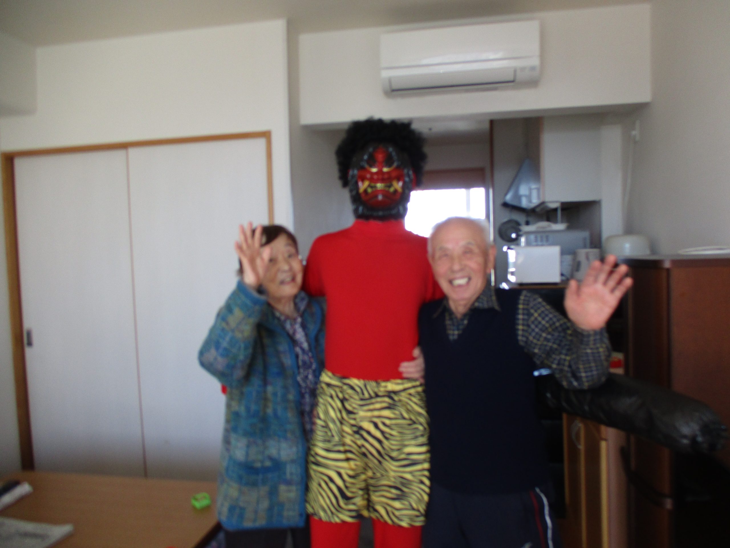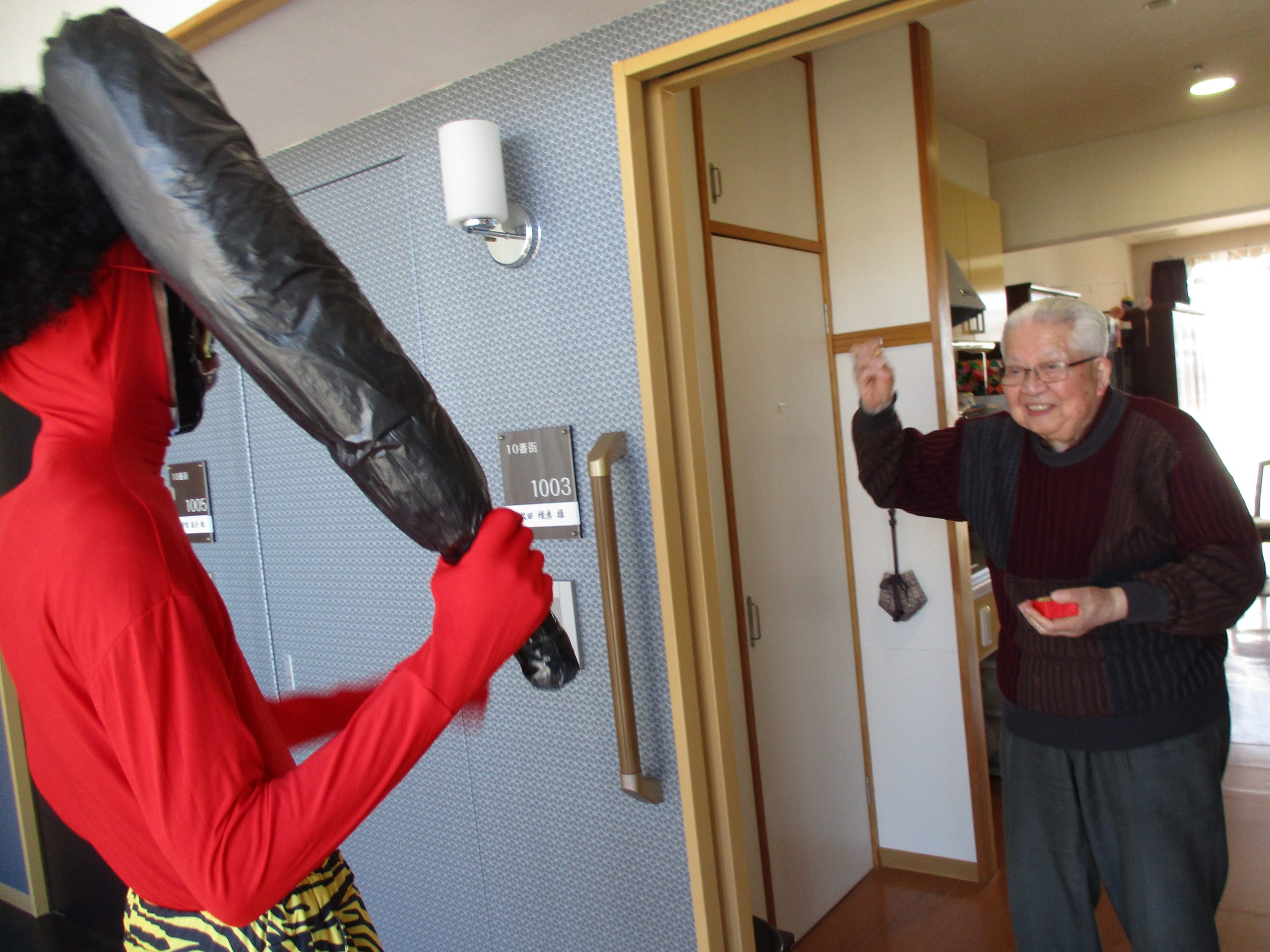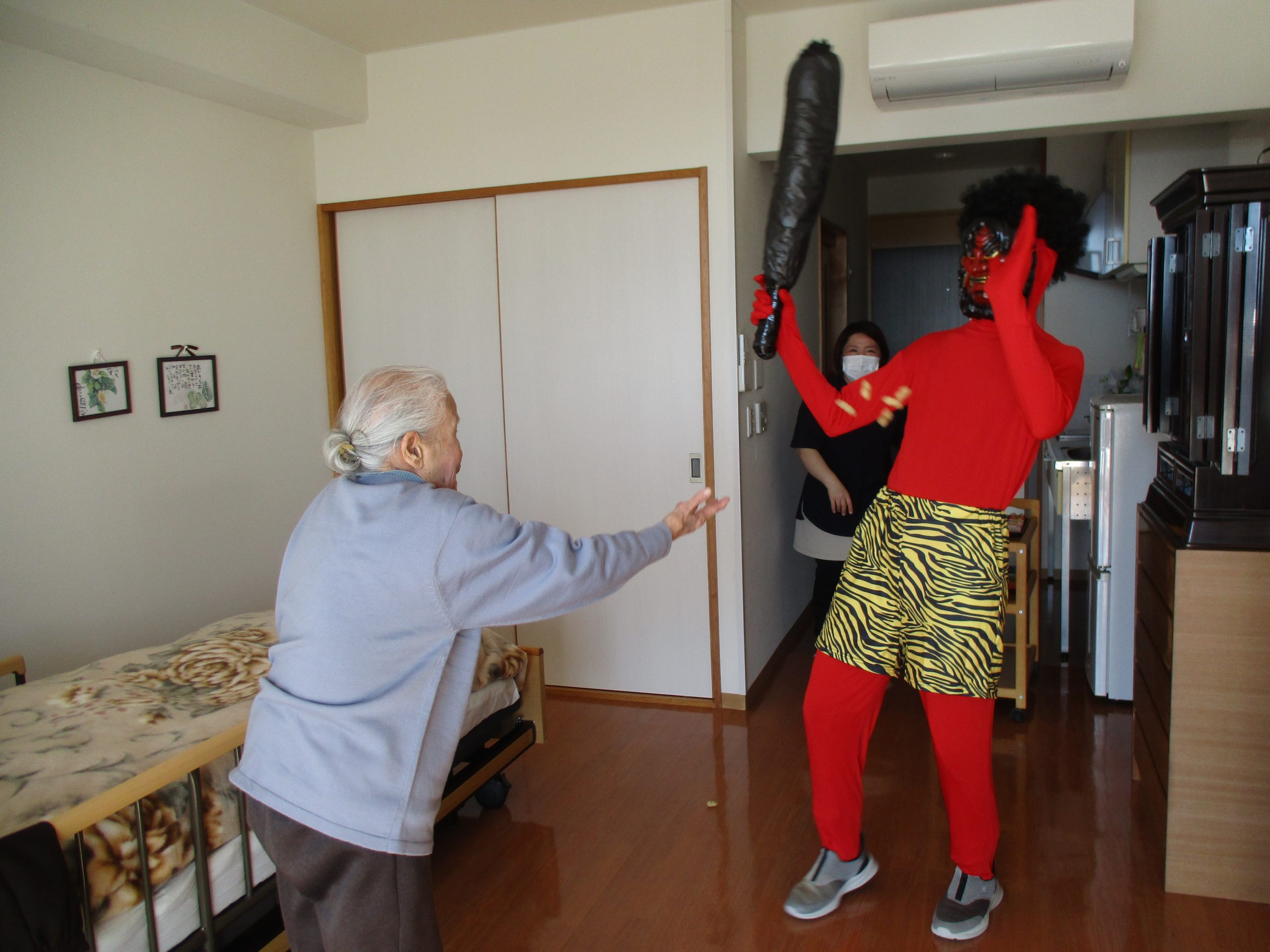 鬼に扮した職員がお部屋に伺い、皆様に退治して頂きました!!!