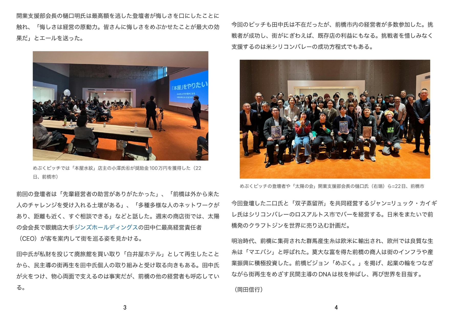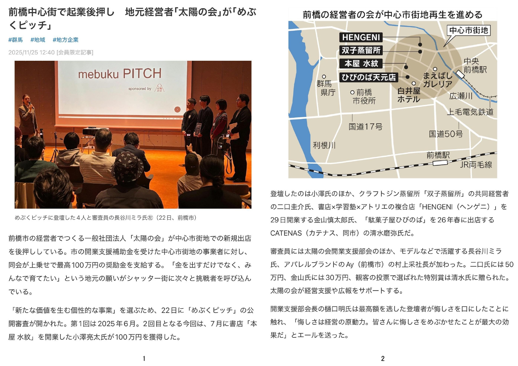 『mebuku PICHI』とは、まちづくりの「太陽の会」で行っている、弊社代表が部会長を務める開業支援部会の活動です。まちなかに新事業を展開する若者を対象に開催しているビジネスピッチです。